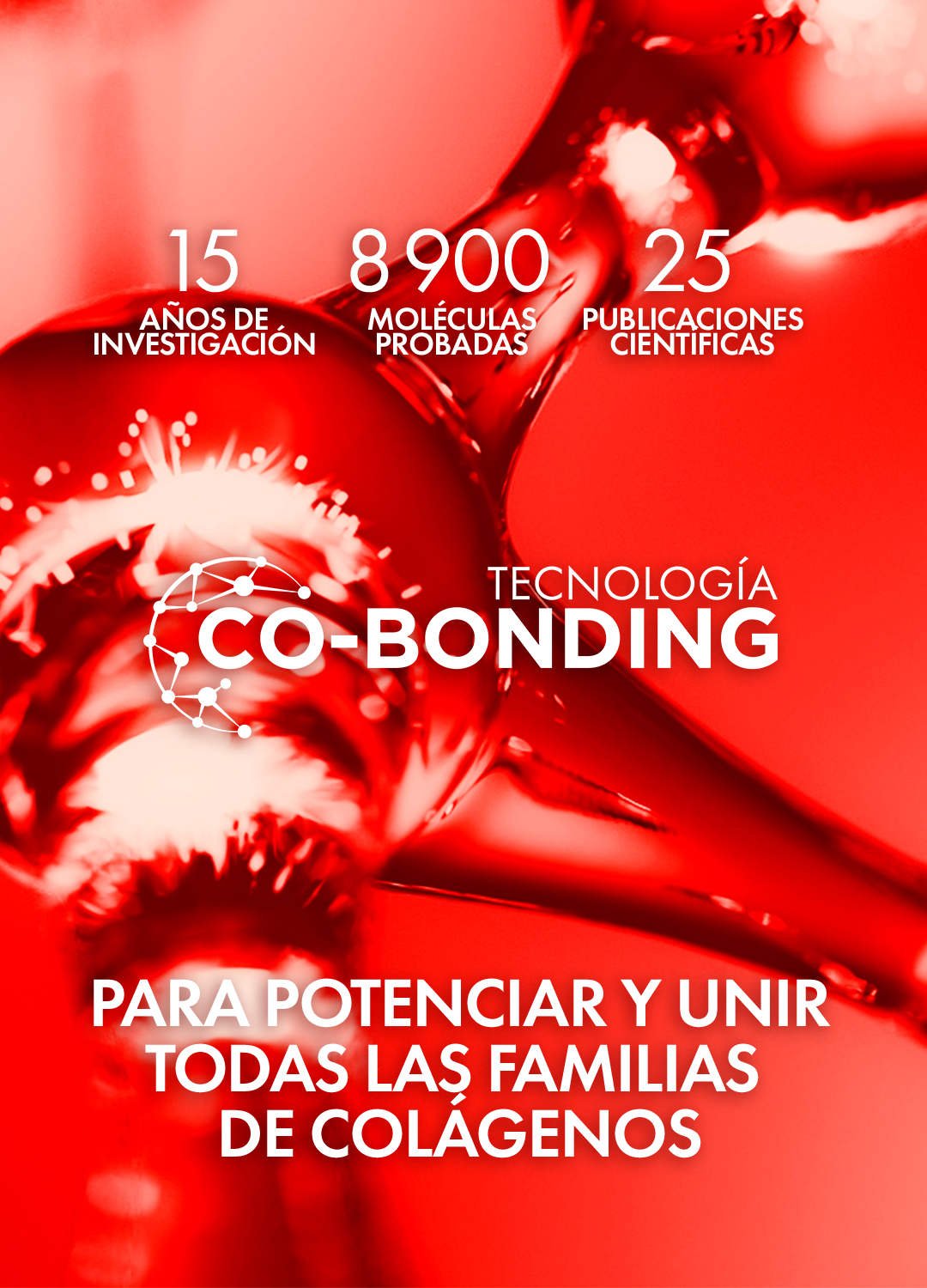 Tras 15 años de investigación, más de 8900 moléculas analizadas y 25 publicaciones científicas, Laboratorios Vichy presenta una revolución en el territorio del colágeno, la tecnología Co-bonding. Esta tecnología potencia y une todas las familias de colágeno para ayudar a obtener una red de colágeno más fuerte.