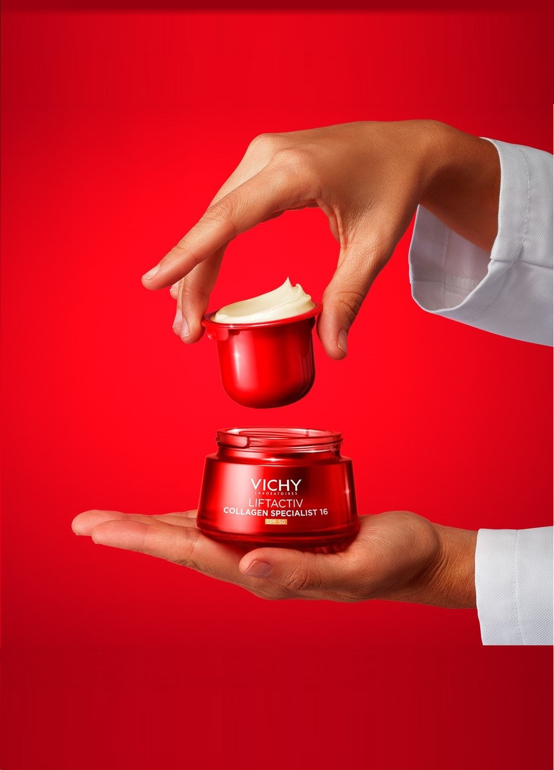 Vichy Liftactiv Collagen Specialist 16 Crema SPF50, con la nueva tecnología exclusiva Co-Bonding que contiene Ramnosa, Péptidos y Maitake, para potenciar y unir todas las familias de colágeno*. Ahora con SPF 50 para una protección frente a la exposición solar diaria. Esta fórmula corrige 16 signos de la edad**, mejorando: arrugas, líneas de expresión, firmeza, volumen, flacidez, tersura, textura cutánea, tonicidad, fuerza de la piel, renovación de la superficie celular de la piel, luminosidad, suavidad, elasticidad, hidratación, vitalidad y uniformidad.